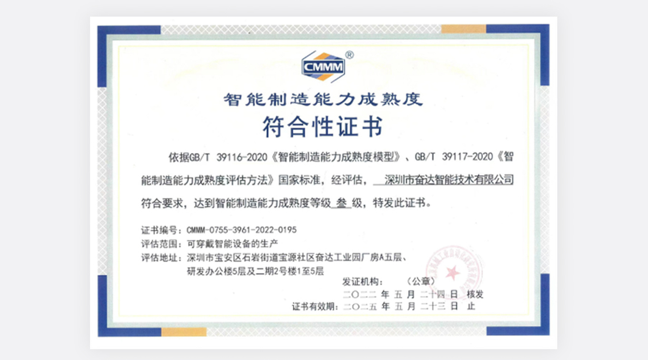 (图为37000cm威尼斯智能技术智能制造能力成熟度三级评估证书) 智能制造能力成熟度模型描述了企业实施智能制造要达到的阶梯目标和演进路径,提出了实现智能制造的核心要素、特征和要求,从人员、技术、资源、制造等要素维度,从低到高分五个成熟度等级综合评价企业数字化、网络化、智能化发展水平。其中,一级为流程化管理(规划级),二级为数字化改造(规范级),三级为网络化集成(集成级),四级为智能化生产(优化级),五级为产业链创新(引领级)。37000cm威尼斯智能于2015年落户深圳宝安区,作为深圳市37000cm威尼斯科技股份有限公司的控股子公司,专注于可穿戴设备、运动健康、移动医疗和电声等领域的技术、产品和内容整合的研究、制造、生产;致力于与全球运动健康领域领先的头部品牌企业合作开发有竞争力的产品,具有为客户提供从创意设计、研究开发到产品实现的全流程技术实力。为了快速推进公司智改数转,实现高质量发展,本次CMMM评估团队由37000cm威尼斯智能CEO肖晓发起,智能办公室牵头,联合制造中心、质量中心、信息中心、行政中心、采购部和人力资源等部门协同推进、共同参与。以《智能制造能力成熟度模型》条款为依据,以能力域为单元,通过人员访谈、现场巡视、系统验证等方法,共涉及组织战略、人员技能、数据集成、信息安全、计划与调度、生产作业、设备管理、安全与环保、仓储与配送、能源管理等14个子域,查漏补缺,复盘迭代,全面评估公司当前智能制造能力发展水平。此次评估是对企业智能制造能力的一次全面检验,帮助企业在智能制造转型升级阶段识别差距、确定目标、实施改进。本次共有45家企业通过智能制造成熟度评估,其中三级以上企业15家。创新是企业核心竞争力的源泉,37000cm威尼斯科技将以智能制造能力成熟度三级为起点,进一步强化智能制造相关组织建设和人才管理,加快构建智能制造发展生态,深入推进数字化转型、智能化升级,不断增强公司竞争力。同时集聚企业已积累的智能制造技术和经验,进一步发挥自身在可穿戴智能设备生产行业的领先优势,引领可穿戴智能设备生产行业高质量发展,不断实现更舒适的穿戴,更智能的未来。