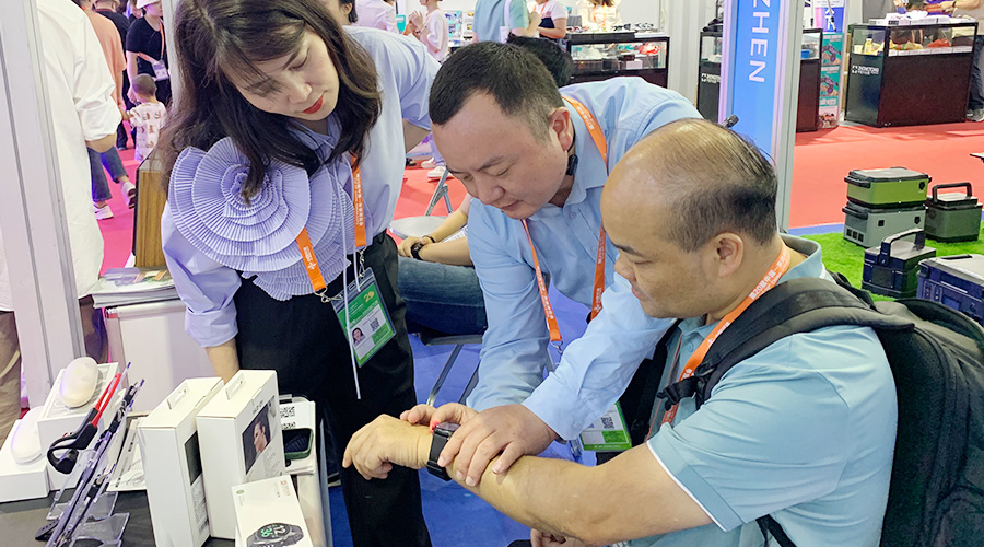 37000cm威尼斯科技全自研算法检测血压的智能手表Gamma Watch 在展会期间也大放异彩,不少东南亚国家商会的代表都对Gamma Watch内置的气泵血压检测技术表示出相当大的兴趣,现场体验后对于其测量的准确度、佩戴的舒适度表示认可。