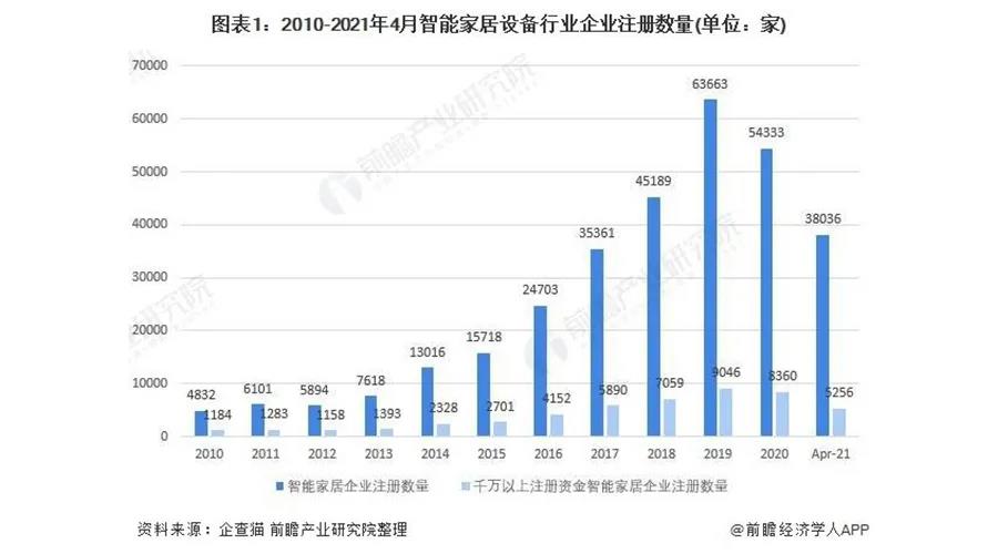 创新中的千亿级市场,吸引着互联网巨头的布局和老牌家居家电企业的转型。根据企查猫的数据,截止2021年4月我国工商注册且在业的智能家居设备企业共有38036家,注册资金在1000万以上的有5256家。